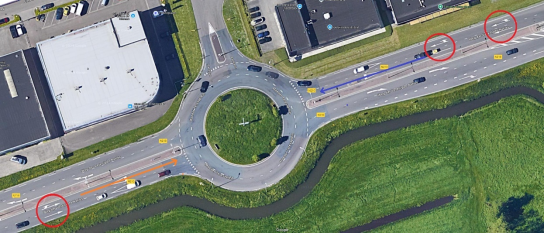 Afbeelding 1. De verkeerssituatie op de plek van het ongeval, met de rijrichting van [A] (oranje pijl) en [gedaagde 1] (blauwe pijl) en rood omcirkeld de pijlen op het wegdek.
