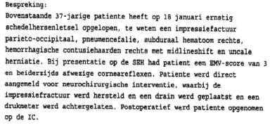 [betrokkene] is naar het Medisch Spectrum Twente (verder: MST) gebracht, waar zij dezelfde dag nog twee keer aan haar hoofd wordt geopereerd. Op de Intensive Care noteert intensivist dr. Cornet van het MST het volgende: