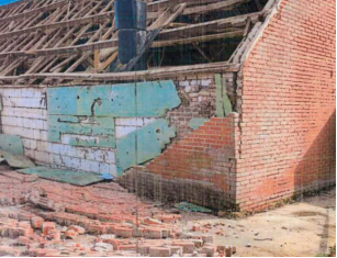 Dit heeft echter alleen daadwerkelijk op kunnen treden doordat de spouwankers in de muur waren doorgeroest (zoals op de foto’s zichtbaar is)[rechtbank: bedoeld is onder andere de hierboven afgebeelde foto 4], waardoor geen constructieve verbinding met het binnenspouwblad meer aanwezig was. In de oorspronkelijke situatie was, voor zover ik dat kan beoordelen, sprake van een wankel evenwicht dat door het verwijderen van de golfplaten is verstoord.”