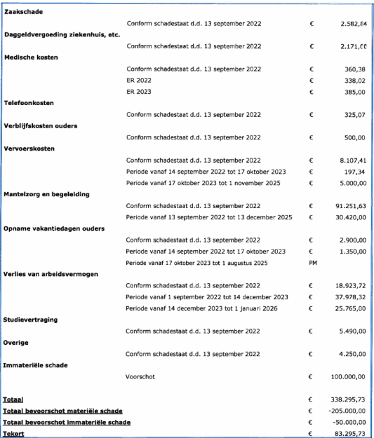 Daarnaast heeft de rechtbank vastgesteld dat [verzoekster] na 13 september 2022 nog minstens de volgende schade heeft geleden: