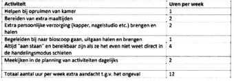 - mantelzorg en begeleiding door ouders; 12 uur x € 10 over 3,25 jaar; hoger uurtarief van € 15 niet onderbouwd