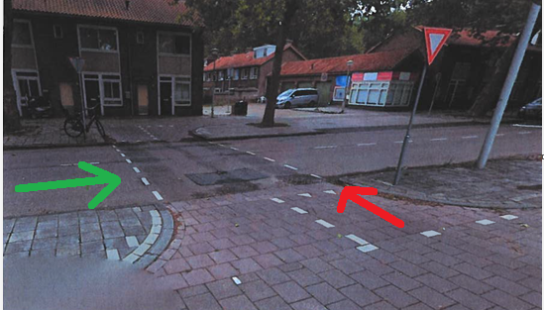 Op ondertaande foto wordt de rijrichting van [scooterbestuurder] weergegeven met de groene pijl en die van [verzoeker] met de rode pijl. Op de plek waar de pijlen elkaar kruisen, zijn zij met elkaar in botsing gekomen.