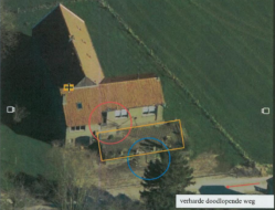 Ik, rapporteur, inspecteerde de stenen buitentrap nabij de toegangsdeur van de woning. Ik voelde aan diverse stenen. Door mij werd één losliggende steen aangetroffen. De andere stenen van de trap lagen vast. De losliggende steen bevindt zich, in de breedte van de trede, op de rand van het bordesgedeelte van de trap (rood gearceerd) op een afstand van 22 centimeter van de stenen muur.