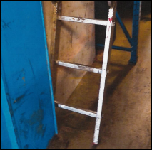 De rechtbank heeft bij de plaatsopneming in de garage van [gedaagde] op 12 september 2014, met verwijzing naar het proces-verbaal en bijgevoegde foto’s 1 tot en met 5, het volgende waargenomen. In de garage staat op de vloer een metalen ladder die de verbinding vormt met de in de garage aangebrachte open vliering. De afstand van de vloer tot de vliering, gemeten tot aan de bovenkant van de vlieringvloer en loodrecht, is 3,09 meter. De ladder staat schuin, zo dicht als mogelijk bij een zijwand, waarbij de linkerstijl van de ladder (bij vooraanzicht) met de poot ingeklemd staat tussen de zijwand en een haaks daarop staande wand van een inpandig kantoor, in een hoek dus. In de houten vlieringvloer zitten twee inkepingen, waar de stijlen van de ladder aan de bovenzijde, onder de bovenste sport, in vallen. Ter illustratie verwijst de rechtbank naar de hieronder in dit vonnis opgenomen foto’s 1, 2 en 3, die corresponderen met de foto’s 2, 3 en 5 bij het proces-verbaal.Foto 3