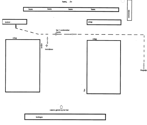 De route die de medewerkster heeft gevolgd, is op de onderstaande tekening aangegeven met de streepjeslijn (waarbij zij van rechts naar links liep). Het betreft een schematische tekening waarop de afstandsverhoudingen niet overeenkomen met de werkelijkheid. De ruimte tussen de twee verticale rechthoeken geeft het gangpad aan, dat in werkelijkheid ongeveer 1.50 meter breed is.