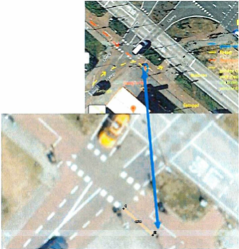 Figuur 4: afbeelding [bedrijf] Rapport, productie 11 verzoekschrift, p. 11, met daaronder de tekst: “De aanrijding vond enkele meters voorbij het kruispunt plaats; de politie volgend was dat zo'n 4 á 5 meter voorbij het kruispunt.”)