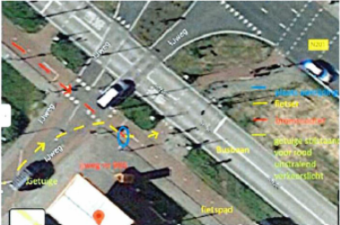 Het ongeval heeft plaatsgevonden in [plaats] ter hoogte van de plek waar de [straat] en de [straat] elkaar kruisen. [A] reed op het fietspad dat parallel loopt aan de [straat] (hierna: het fietspad), in figuur 1 met rood weergegeven. [A] reed door een groen stoplicht. [verzoekster] reed op de [straat] en sloeg rechtsaf het fietspad op waar [A] reed, in figuur 1 met geel weergegeven. [verzoekster] was van plan direct daarna linksaf te slaan om de [straat] over te steken. De blauwe cirkel is de plek waar [verzoekster] en [A] elkaar raakten.