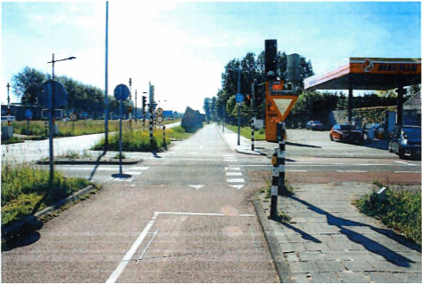 Deze foto in figuur 3 geeft het perspectief van [A] weer. [A] reed hier door een groen stoplicht. [verzoekster] kwam van rechts het fietspad oprijden.