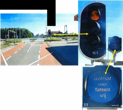 “Indien onder of bij een driekleurig verkeerslicht een bord is geplaatst met de tekst «Rechtsaf voor (brom)fietsers vrij» respectievelijk« Rechtsaf voor fietsers vrij» gelden het gele en het rode licht niet voor rechts afslaande fietsers, bromfietsers en bestuurders van een gehandicaptenvoertuig respectievelijk voor fietsers en bestuurders van een gehandicaptenvoertuig. Zij dienen alsdan het overige verkeer ter plaatse voor te laten gaan.”
