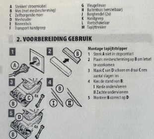 Uit de montage-instructie op de website van [gedaagde 1] (…) maken wij op dat de montage van het mes in ieder geval dient te geschieden met de brede lederen/rubberen mesbeschermer om het mes en met gebruik van handschoenen. Wij hebben de brede lederen/rubberen mesbeschermer niet overgelegd gekregen, naar verluidt omdat deze ook niet bij het verhuren van de tapijtstripper door [gedaagde 1] wordt meegeleverd. Ook de handschoenen zijn zoals eerder gemeld bij het verhuren van de tapijtstripper niet meegeleverd.