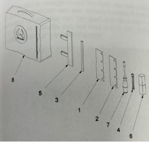 Conform de onderdelenlijst (bijlage 1) en de explosietekening van de toolkit (bijlage 2) wordt de tapijtstripper geleverd inclusief twee messen (afbeelding 3, onderdeel 1 en 2), een smalle kunststof mesbeschermer (afbeelding 3, onderdeel 3), een brede lederen mesbeschermer (afbeelding 3, onderdeel 5) en handschoenen (niet op tekening).