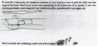 ‘(…) Ik weet niet wie er schuldig is aan het ongeval. Het moet een van de andere bestuurders van de auto’s zijn geweest. Ik ben volgens mij vanachter aangetikt. (…)’
